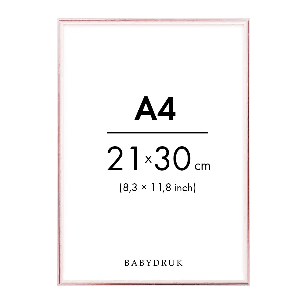 Ein eleganter rosafarbener Metallrahmen, in den 21×30 cm große Poster passen. Der Metallrahmen ist mit kristallklarem Acrylglas ausgestattet und lässt sich auf der Rückseite mit seitlich drehbaren Metallklammern leicht öffnen. Das Glas ist auf beiden Seiten mit einer Schutzfolie geschützt, die vor dem Gebrauch entfernt wird, um ein perfektes Erlebnis zu gewährleisten. Unsere rosafarbenen Metallrahmen im Format 21×30 cm sind mit zwei Aufhängern aus Metall ausgestattet, sodass sie sowohl horizontal als auch vertikal aufgehängt werden können.llic Frame (21x30cm)